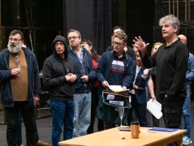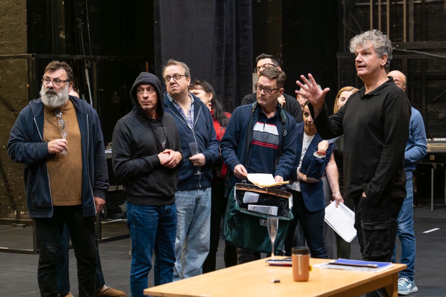 B. B.: Ritával régóta dolgozunk együtt, szinte szavak nélkül is értjük egymást. Most is egy olyan világot teremt, ami egyszerre játékos és gondolatébresztő – és egy kicsit ironikus is. A díszlet többfunkciós, mozgatható elemekből épül, amelyek folyamatosan változó tereket hoznak létre. Hátul egy nagy állványzat magasodik – mint egy örökké épülő ház, ami sosem készül el. Ez az állandó félkészség a darab világát is tükrözi: egy várost látunk, ahol mindenki buzgón épít valamit, de senki sem tudja, mit és miért.