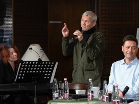 Keller János, aki a Sirályban Molnár G. Nóra édesapját, Ilja Afanaszejevics Samrajev, jószágkormányzót játssza, az önálló estjének, Volt egy fiú…- Szécsi Pál 80’ egyik dalát adta elő.