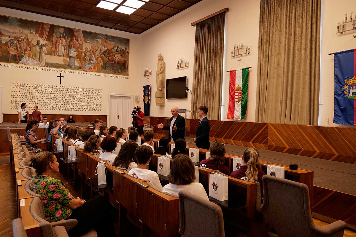 A fogadás után a húsz határon túli fiatal körbevezetést kapott a Polgármesteri Hivatalban, megtekinthették a kiállított koronázási emlékek hiteles másolatait, valamint a polgármesteri irodába is bekukkanthattak, sőt akár a polgármesteri székbe is beleülhettek.